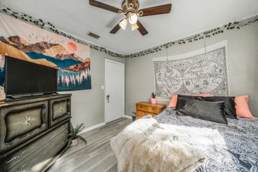 The main bathroom was remodeled in 2023 and features a sink with plenty of counter space, a deep soaking bathtub, and an extra high showerhead standing about 6 ft 5 inches from the tub. This is perfect for our taller guest!. The half-bath is located in the large back bedroom comes with a private toilet and sink. The master bedroom has a private bathroom and small closet. The bathroom has a toilet, sink, and standup shower.